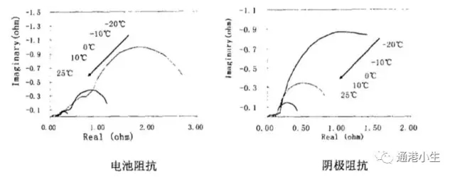 电池阻抗主要体现为电化学反应阻抗,而欧姆阻抗相对较小。由下图可知。随着温度的下降,电池阻抗逐渐上升,且下降至0°C以后,阻抗速度增大,阴极阻抗呈类似的趋势,从数值上来看,电池的阻抗主要来源于阴极阻抗的贡献。